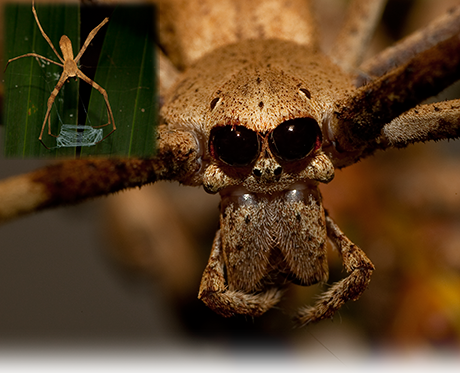 My new favourite! This arachnid is cool, rather scary... but cool. It catches its prey by holding some stretchy web between its front legs. When an insect walks by it "casts its net" by springing its legs forward and wrapping the pray in it.